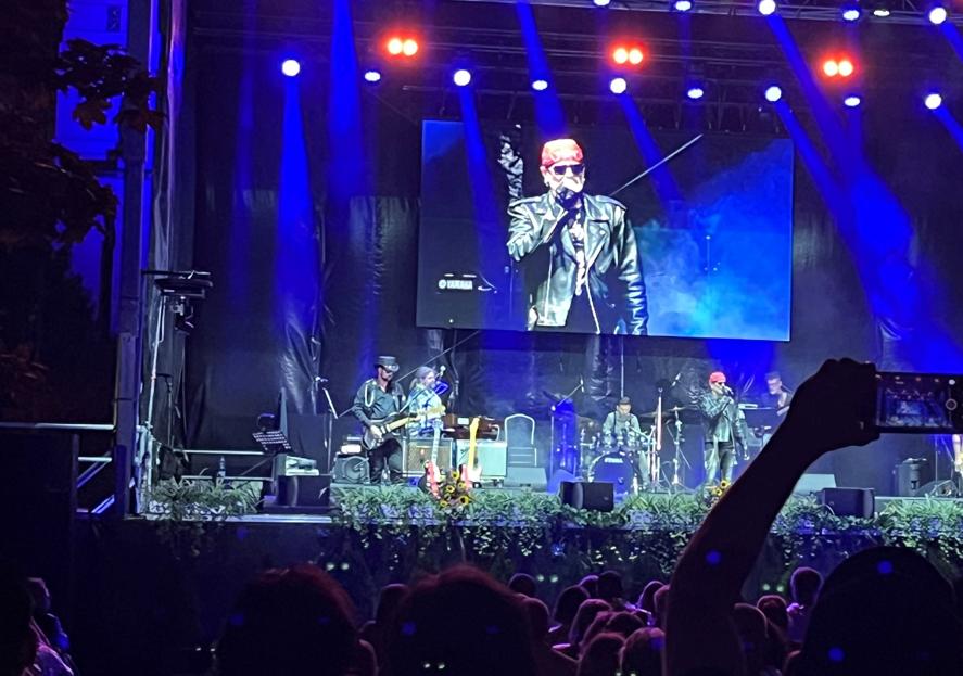 Live-Foto vom Nachklang am Wiener Zentralfriedhof zur freien Verwendung bei Angabe von © Johann Pinter: Die Ostpartie vor rund 5000 Zuseher*innen bei „Nachklang 2025“ am Wiener Zentralfriedhof, v.l.n.r.: Tom Eichinger (Gitarre), Klaus Bergmaier (Klavier, Orgel), Martin Freudenschuss (Gesang), Klaus Weber (Schlagzeug), Martin Mondl (Bass)